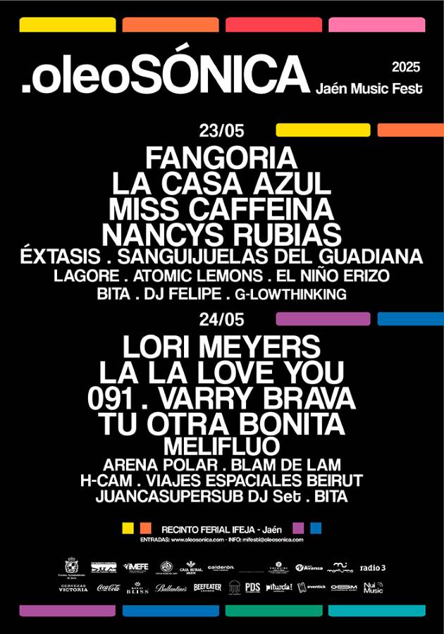 oleoSÓNICA Jaén Music Fest se celebrará los próximos 23 y 24 de mayo en el Recinto Provincial de Ferias y Congresos de Jaén (Ifeja). El cartel al completo, así como el enlace a la taquilla virtual, se encuentra en la web del festival: www.oleosonica.com