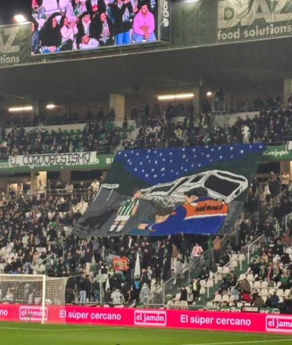 Con un tifo que aludía al accidente ferroviario en Adamuz hizo sentir el homenaje a las victimas y resaltar la actuación de los vecinos de la localidad y a todas las ayudas de emergencias desplegadas haciendo un simbólico saque de centro a dos chavales que participaron activamente en aquellas horas fatídicas y que desde esta tribuna les hago llegar mi gratitud por su comportamiento leal y cívico.